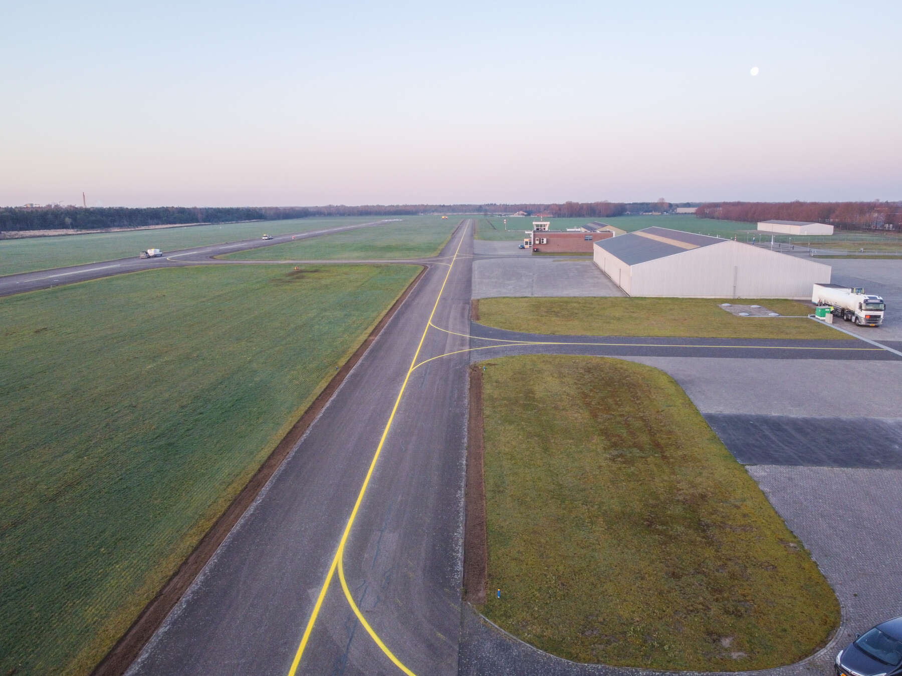 Iedere dag opnieuw komen wij op de mooiste locaties, maar sommige locaties zijn echte pareltjes. Zo ook Kempen Airport in Budel. Op de landingsbanen mochten wij op een bijzonder zonnige dag in maart ruim 3300 strekkende meter scheuren herstellen, 475 m² asfaltonderlaag vervangen en ruim 1000 m² nieuwe asfaltdeklaag aanbrengen.